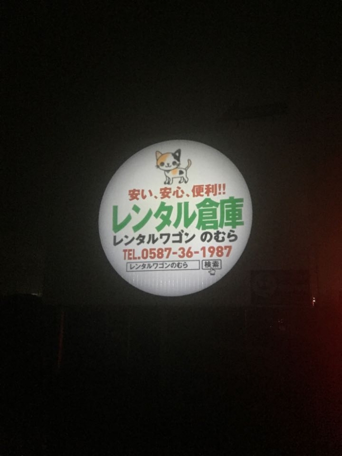 今回は西尾張中央道の看板に投射致しました。日中は真っ白ですが夜になると壁に文字が浮かび上がってきます。