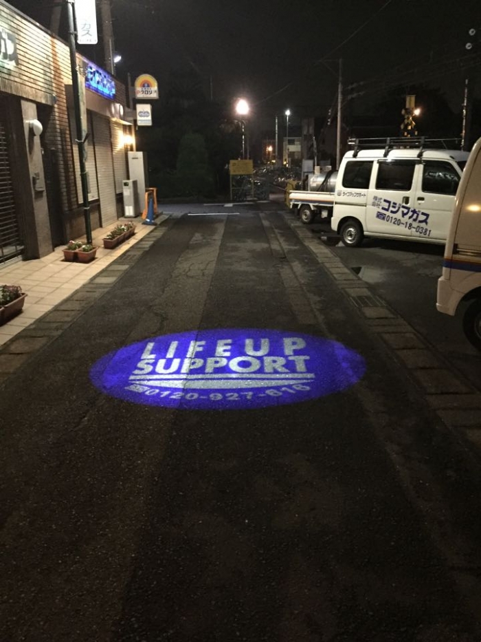 お客様のオフィス前にLEDスポットライトサインを投射させて頂きました。電車帰りの自転車置き場への通り道ということで、かなり目立っています!